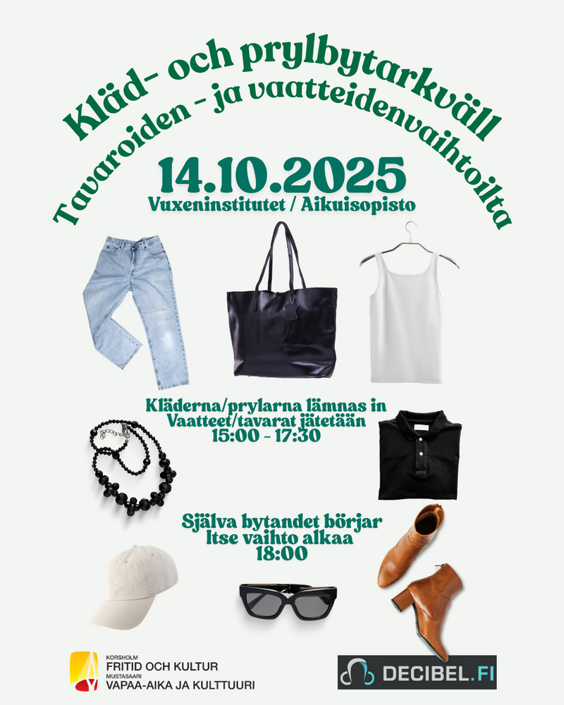 Du kan lämna in dina kläder eller prylar Tisdagen den 14.10 mellan klockan 15:00 - 17:30. Själva Bytet börjar klockan 18.