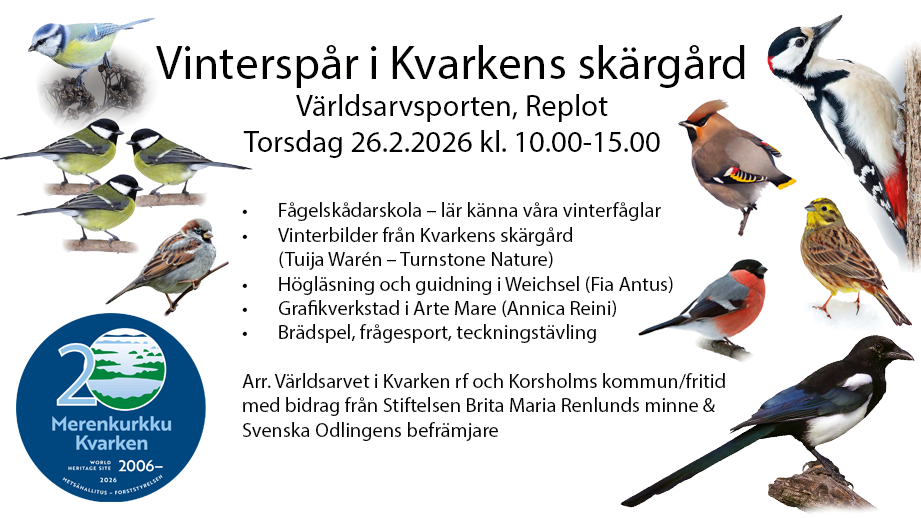 Järjestäjä: Merenkurkun maailmanperintö ry ja Mustasaaren kunta/vapaa-aika tukena Brita Maria Renlundin muistorahasto & Svenska Odlingens befrämjare